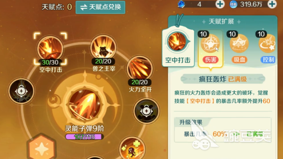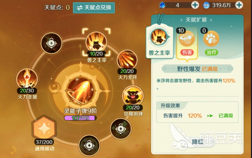 天赋加点的话,来看一下PVE的搭配当中是优先把这个火力全开全部点满,点满之后再去点个兽之主宰,然后带治疗的话,有奶妈的话可以不点,如果是没有奶妈的话,那可以降直接去加通用被动里面的一个枪火之力,提升攻击力,那么觉醒咆哮的话呢,这边依然是全部点满,然后再点火力支援,火力支援的话两个伤害点满,然后减速的话这边就是可点可不点,大家想要参与团战的话,基本参与PVP的话用上面技能搭配没什么好说的,优先把野性链接这个核心点起来,包括其中的单体效果那一套也是一样的,把其中核心的野性链接、治疗免控全部点完。