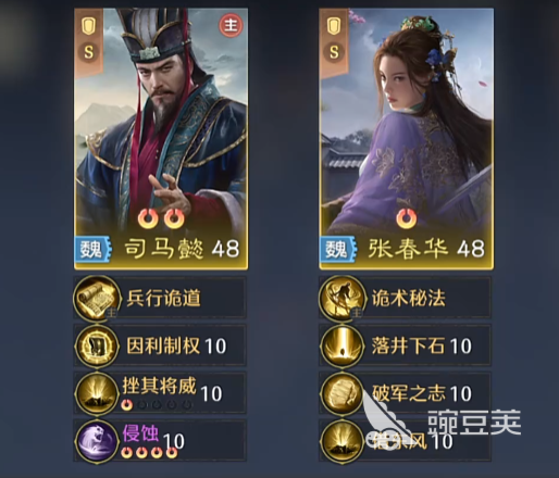 虽然在这里带来的是法术输出的一个提升能力,但是后期他在他的挫其将威之后还可以提升对于对面将领的一个削弱效果,所以在这里的司马懿强度上面来说的话,他也是属于可以给曹操带来加成的一个角色,张春华可以带的则是借尸还魂以及君心我心,在这里战斗当中,这两个技能可以增加张春华各项属性效果,可以带来的中毒持续输出能力也会更强,而且可以在层数叠加足够的时候也为队伍带来足够的输出提升。