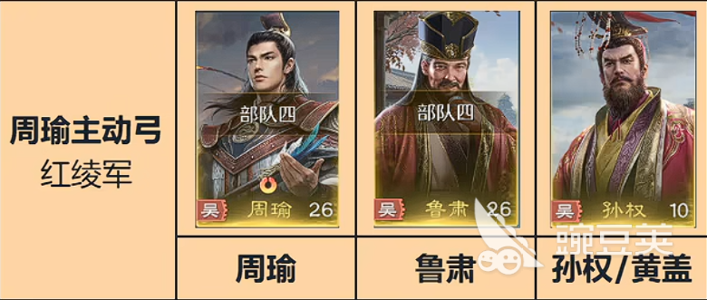 孙权在上面搭配了周瑜、鲁肃之后这个阵容就成型了,或者是搭配黄盖也行,这里周瑜的机制,就是给全体造成主动技能的时候会有一堆的伤害和燃烧,而鲁肃有一个比较高概率的主动技能,并且能使主将的谋略伤害提升,这个特别好用,并且增加统帅和智力就能让这个周瑜伤害打的更高,那孙权他的收益就是百搭的,孙权在吴国只要是兵种适配,都能用,就非常百搭,他的机制就是是全队的这个统帅、武力、智力都能提升50点了,所以这三个人组合就是一个很好的体系,但是孙权也比较难抽,所以大家也可以选择用这个黄盖,但是如果用黄盖的话,这里就只能走这个盾兵搭配了,如果用孙权就是走弓兵,黄盖会对自己的部队造成一个武力伤害,但是黄盖这个技能的伤害系数仔细一算的话,他对敌方造成的伤害系数是一个400的伤害系数,所以说,没有孙权就无脑上黄盖,也是很好用的一个组合。