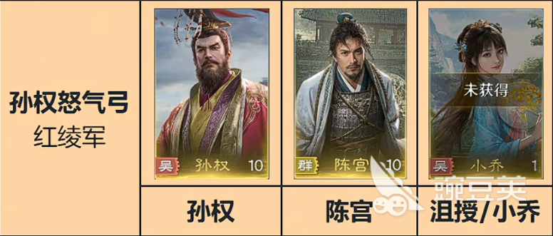 那接着第二套,就是孙权怒气弓,孙权+陈宫+沮授,或者上小乔也行,孙权的这个主动就是一个百搭的主动效果,也有比较不错的大招技能,一般造成的谋略伤害系数大概像吕布的话是1200左右,就是人多才到1800,那算全这个技能直接是2500,然后还带一个驱散负面状态,这都特别的强,所以孙权的怒气技能就是全游戏最强的,如果孙权红度提到了五红,一红和三红都是辅助,都是让孙权的辅助技能变强,但是拉到武红的话,主将伤害加30%,从2750再加30%,且主将命中3个以上目标时,自身怒气加100,满红孙权真就是炮塔,而如果需要用孙权呢,这里就会有一个满红小乔出现了,小乔是每秒3点怒气,并且每秒有一个受到伤害降低只是3秒,就这个减伤效果很一般,大概只有一个7%的减少效果,然后每两回后其实收益也不高,但是小乔进阶也有一个很不错地方,首先是一红的伤害降低无所谓,但是三红就变态了,每秒恢复5点怒气,这时候就有点东西了。