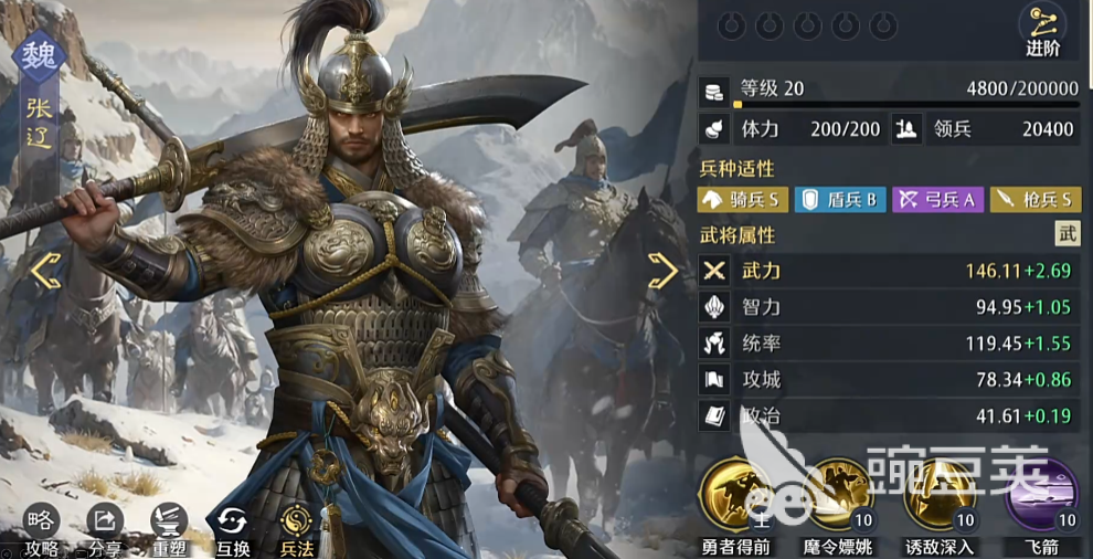 第二个为大家推荐的就是张辽,张辽他的推荐度也是非常高的,张辽在阵容玩法里面可以玩突击,这类阵容目前在张辽的搭配阵容里面,他也是一个主将类型的辅助选手,如果有夏侯渊跟他一起搭配的话,其实作为大势输出还是可以的,他机制上面是有一定强度,但是他实战里面能够带来的能力需要利用到一些技能的机制,需要一些智谋兵法的加成。