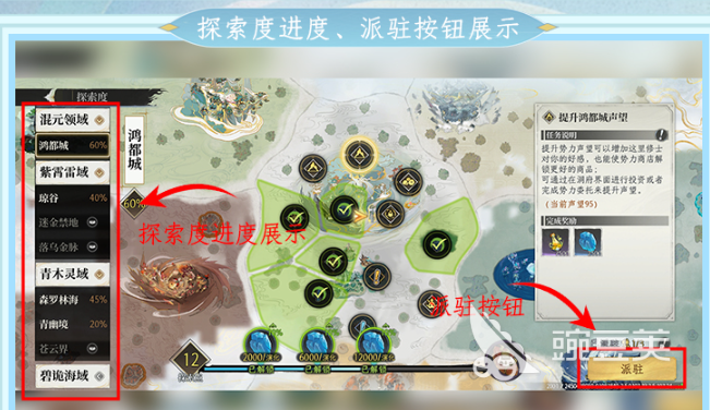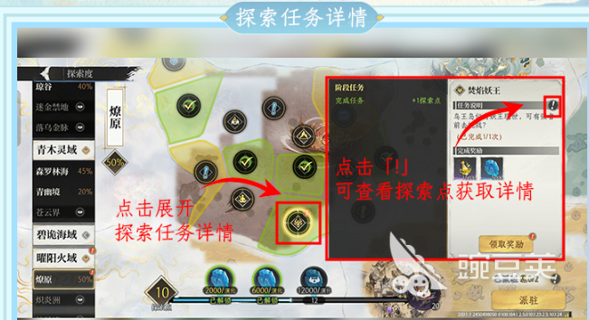 打开地图之后,把视觉拉到最大,就能看到每一个区域的探索进度。在地图的左下角,还可以点击探索图标,能查看所有探索的信息以及任务的要求。左下角的派驻按钮不要忽略,可以派好友或者妖兽去驻扎,能迅速的提升这个区域的探索收益。左侧界面还会显示所有地区的完成进度,中下区域可以看到收益的进度,中间则是详细的任务列表。探索点越高,那后续所能获得的资源也就更加的丰富,记得要及时去领取奖励。
