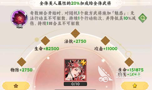 美人系统中还有一个需要注意的一点,就是美人系统中还有着升级的机制,在美人系统中不断给美人升级,那美人的专属技能效果也就变得更加的有效果,比如说貂蝉的魅惑在没升级时能够短暂的迷惑对手,可是在升到1级以后,给敌方武将在施加上魅惑以后,敌人不仅没办法行动且魅惑还无法驱散,这种效果能够直接持续1轮战斗,战斗时还会直接降低对返回10%的减伤能力。