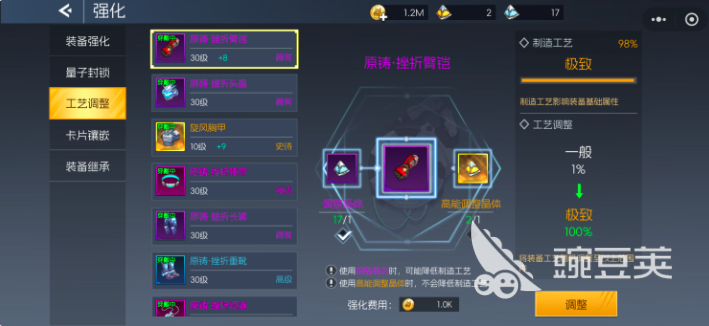第三部分是工艺调整,去该部分对于装备基础制作十分重要,在工业制造上是1%~100%的随机摇摆,玩家初期是无法确定具体的制造工艺等级,但如果有晶核加持,能够大大提升工艺优良程度,也能够让玩家制作出更高端的基础装备。