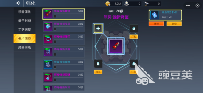 第四部分是卡片镶嵌,也是卡片晶核最常用到的部分,玩家可以在卡槽内镶嵌进不同属性的卡片,不仅可以通过卡片升级来达到更强的效果,而且通过晶核的加持,能够让卡片自身养成数值得到高效突破。(小提示:卡槽数量有限,要想获得更多槽位,需要钻孔机;对于卡槽内已存在卡片时,如果想替换卡片,玩家需要在游戏当中解锁超声取卡器,因此镶嵌卡片要谨慎哦!)