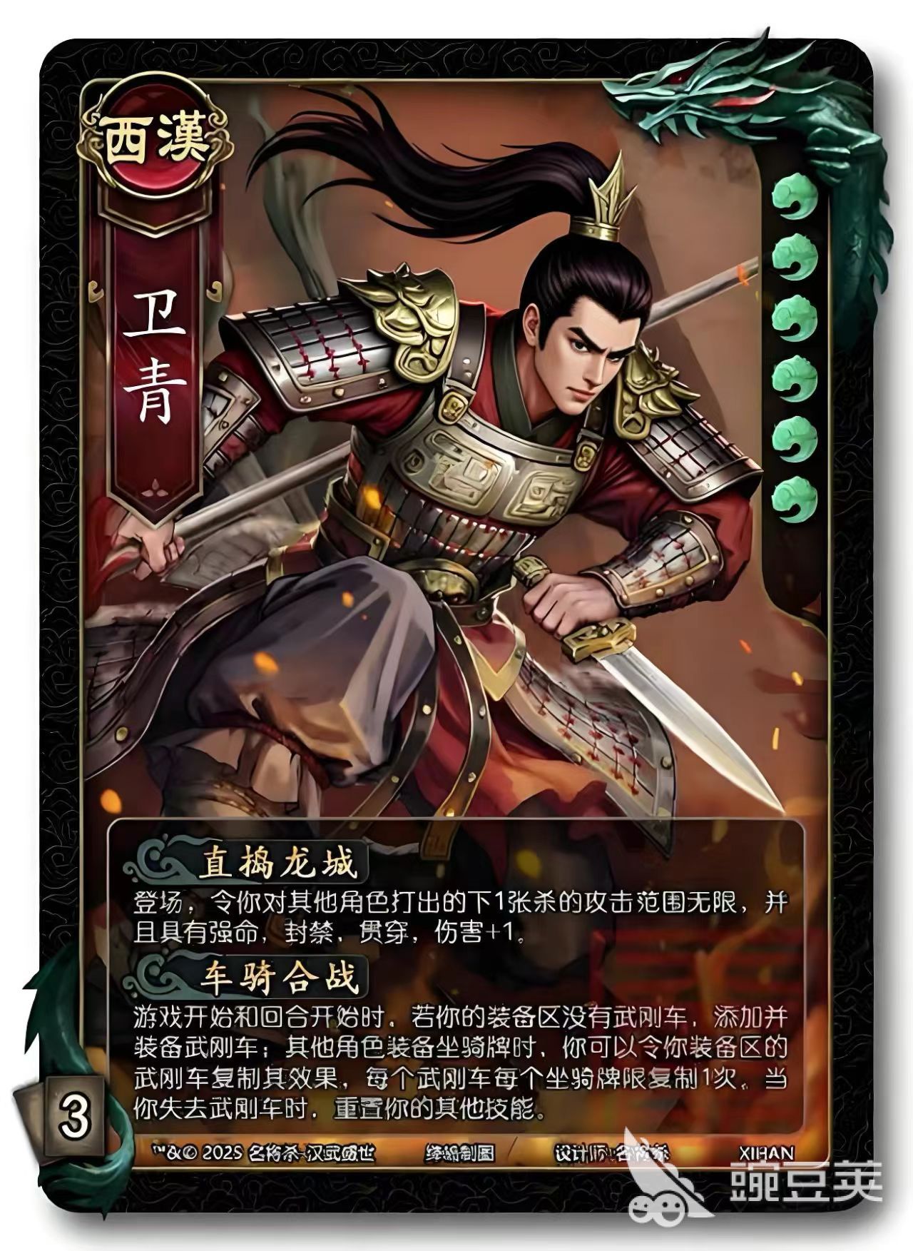 第二技能“车骑合战”构建了卫青的战术循环体系。游戏开始及每回合开始时,若其装备区无【武刚车】,则自动获得并装备。当其他角色使用坐骑类牌(如千里马、绝影)时,卫青可消耗自身【武刚车】复制该坐骑效果一次(每种坐骑限复刻一次)。尤为关键的是,当【武刚车】因任何原因离场,其第一技能“直捣龙城”将立即重置冷却,允许再次触发完整效果。该机制不仅保障了技能释放频率,更强化了卫青在多轮对抗中的持续压制力。