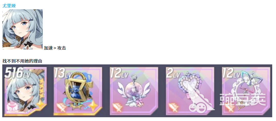 先说尤里娅这个角色,她在天使型里的地位基本上是无可替代的。配装方面主要看两个属性,加速是第一优先级,其次才是攻击力。为什么要这么选呢,因为尤里娅的技能机制决定了她需要频繁出手,加速堆得越高,回合轮转就越快,能够更多次触发她的辅助效果。攻击力虽然也重要,但排在第二位,毕竟她不是纯输出位,主要还是靠技能来带动队伍节奏。装备选择上优先考虑带加速词条的套装,副属性也尽量往加速上靠,这样才能把尤里娅的作用发挥到最大。