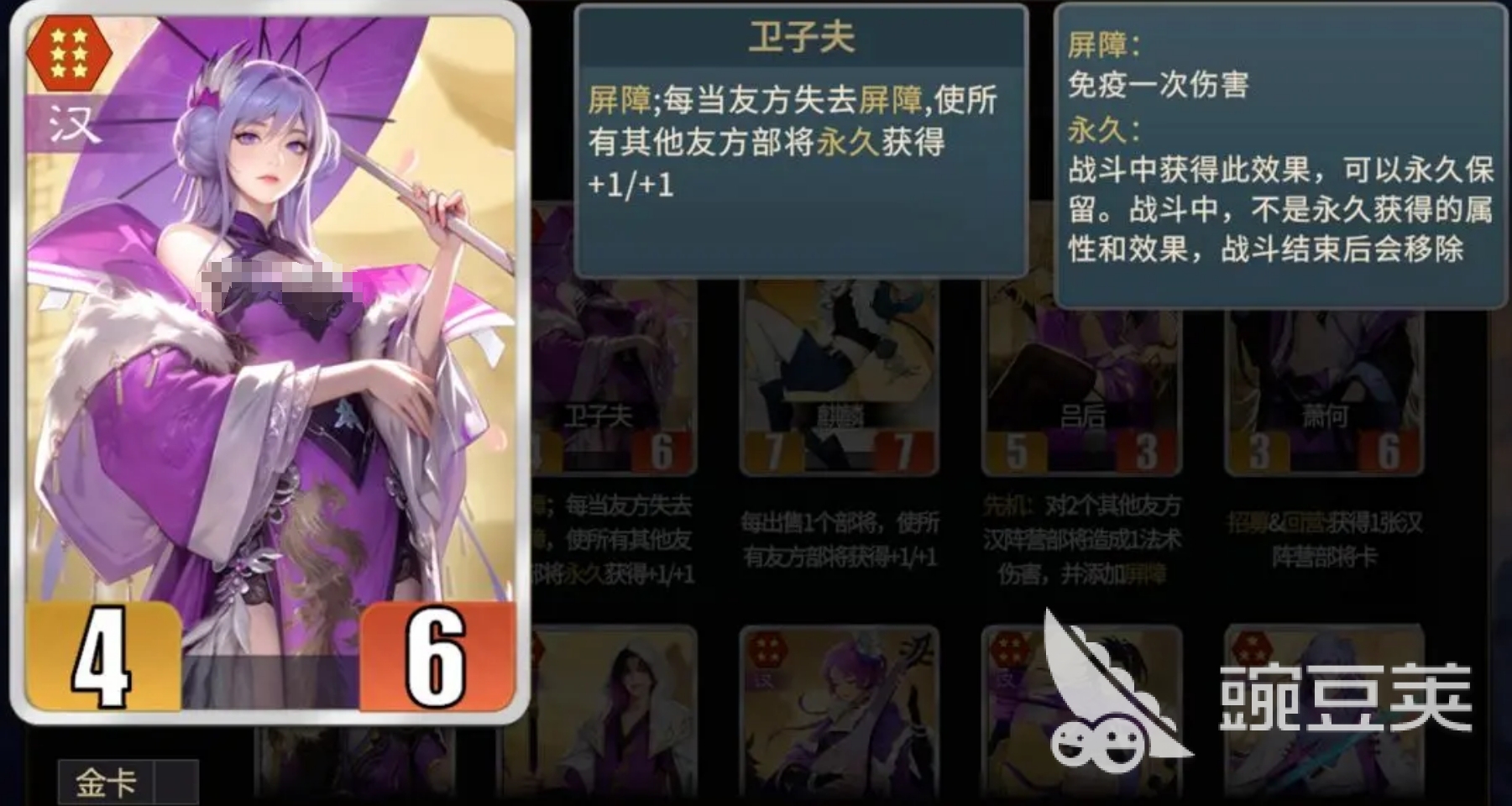 屏障是汉阵营的特殊效果,而卫子夫的能力就是可在友方部将失去屏障时,让所有其它友方部将获得“+1/-1”增益,且该效果在对局里是永久生效的,搭配上能为自己或友方部将套上屏障的角色后,可令卫子夫的能力在对战回合频繁触发,为汉阵营部件快速叠加战力,自然也令她成为了汉阵营核心。