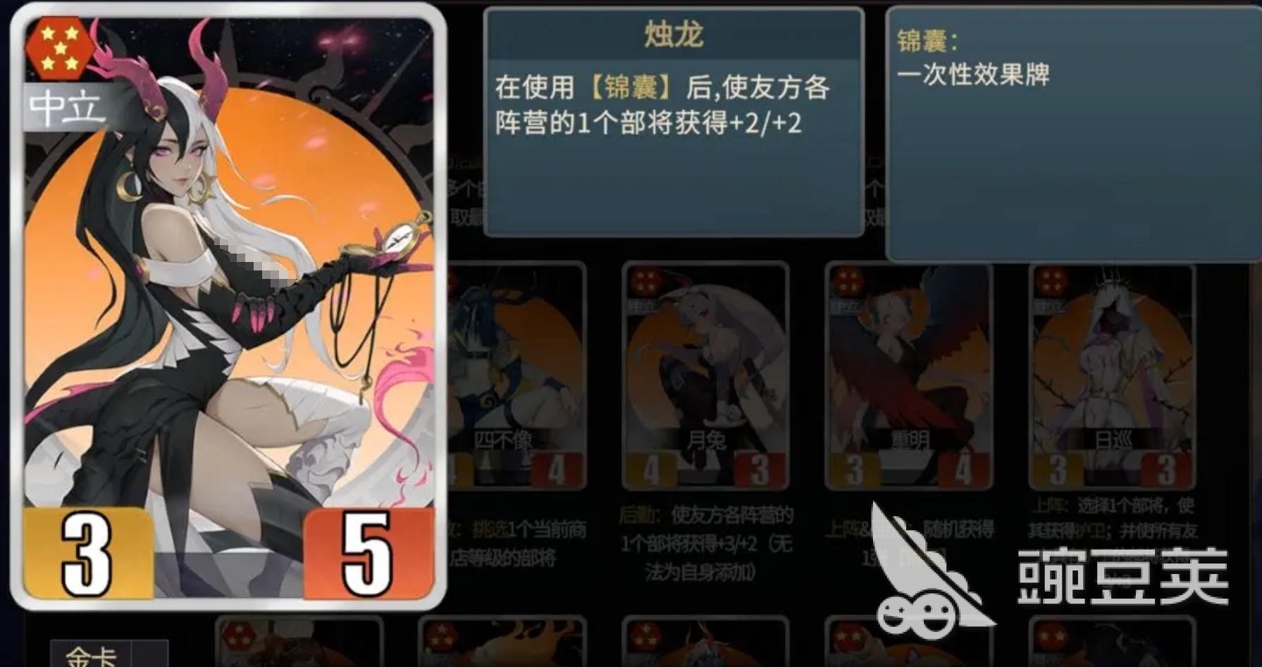 作为中立阵容核心的烛龙可在使用锦囊后,为友方各阵营部件提供属性数值方面的加成,并且各阵营中都有较为好用的锦囊获取角色,比如郭嘉、诸葛果等,也令烛龙并不缺可搭配的队友,可谓极为的百搭,玩家也不会因拿不到某位角色而导致阵容无法彻底成型。