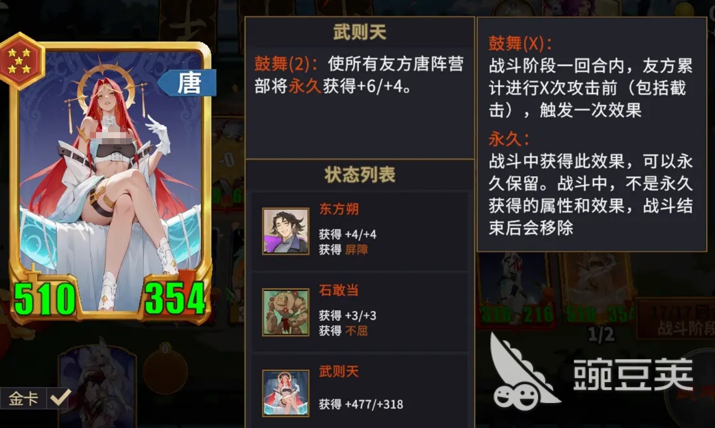 同过鼓舞的效果,让友方唐阵营的部将永久获得“+6/+4”的效果。该机制给的加成数值很高,所以想要叠起来也特别的容易。再加上武则天的机制效果并没有太多的限制条件,只要是唐阵营的部将都能享受到该技能带来的效果,也令盛唐阵营的阵容搭配极为灵活。
