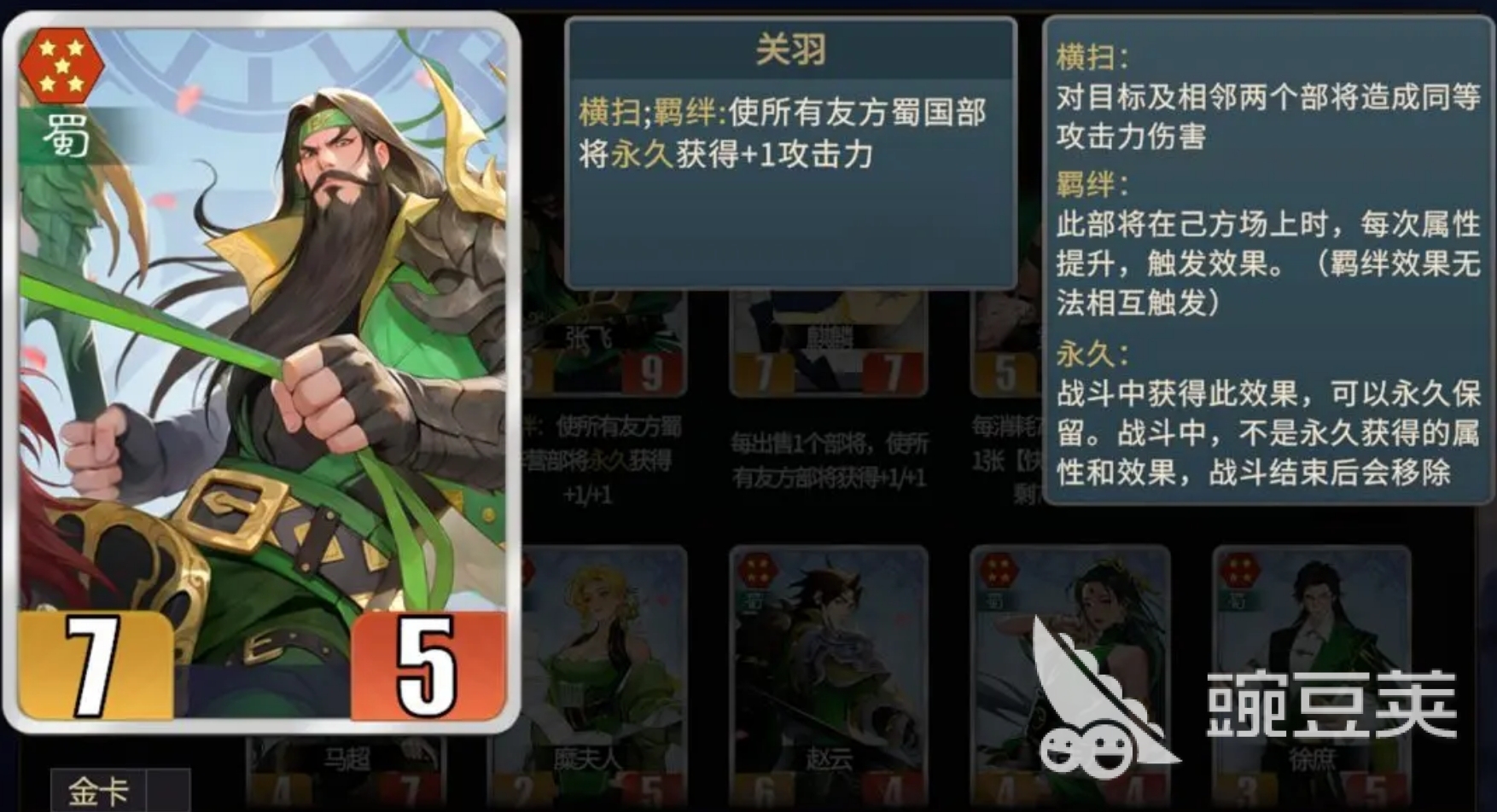 后勤关羽流是蜀汉阵营中上限特别高的一种玩法,通过给关羽锦囊让他提升自己的属性,从而触发羁绊效果叠加攻击力,搭配上蜀国独有的后勤流锦囊玩法,会令蜀国部将的攻击力叠加到极为恐怖的地步,后期甚至能出现一刀秒一个的情况,与张飞搭配上阵效果还会更好。