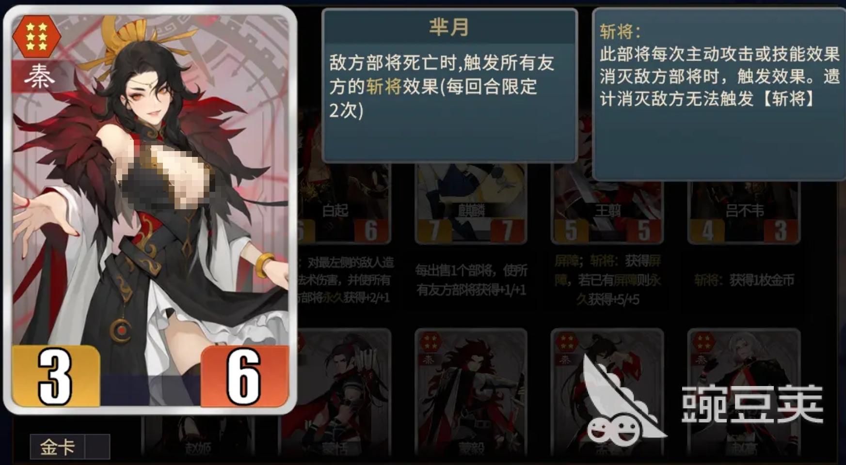 一旦敌方部将在对战回合内死亡,就能触发芈月的机制,让所有友军的斩将效果立刻触发,虽说芈月的机制每回合的触发上限为两次,但在秦阵营可通过斩将效果获得高额战力增益的情况下,依旧能确保秦阵营部将叠出极高的数值,所有玩秦阵营不可不拿芈月这一阵营核心。