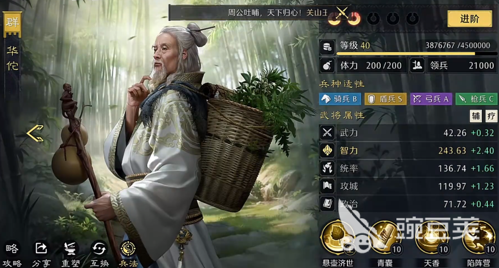 在游戏里,华佗需要挑选最合适的对手,也需要有兵法选择思路,这些兵法对于角色有极大的影响,奋鼓和乐善非常适合华佗,这两个兵法都可以提升治疗能力和治疗数量,惜兵爱民和活力技能可以保证角色的稳定性,想要组建一支更强力的队伍,输出成员是必须的,像华佗这样的辅助成员也必不可少,然后有了均衡的能力之后才能顺利击败对手,保证自己的队伍有更长的续航时间。