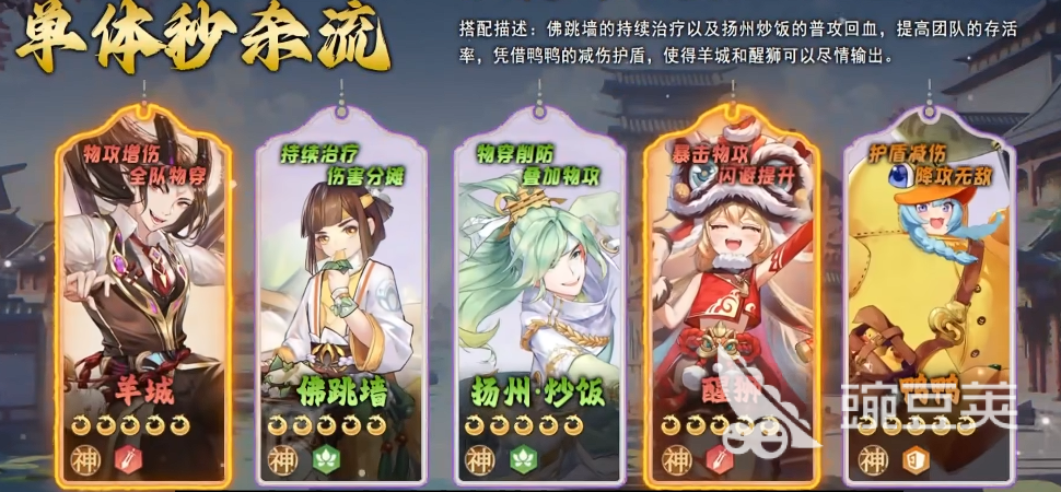 第二个为大家推荐的就是单体秒杀流,这个阵容里面大家可以用到的搭配角色,包括佛跳墙+扬州炒饭+羊城+醒狮+鸭鸭,这个阵容进行搭配组合的时候,大家就注意阵容里面的核心角色就是佛跳墙,因为她的核心能力可以通过自己的持续治疗带来足够的续航时间,而扬州炒饭的也是有类似的效果,在技能使用的时候,可以根据她的普攻进行输出之后还给自身带来一定的回血,所以在团队的生存能力非常强,出站时候都要走一个长时间的输出流派就比较合适了。