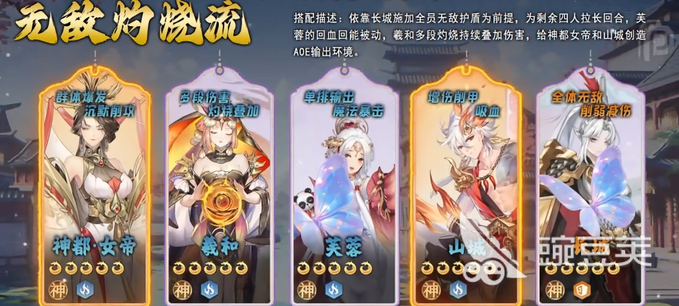 灼烧流里面其实持续伤害的效果是比较无敌的,这个阵容里面大家可以选用的卡牌有,芙蓉+山城+女帝+长城+羲和来进行组成,阵容组合成之后,其中核心的效果就是可以利用长城提供的一个护盾,给其他的队员带来足够的防御能力,而且进入了这个无敌状态之后长城她也可以提升整体队伍需要的生存回合,在延长时间上面她是有足够的机制可以利用起来,而芙蓉的话她放在这里,根据自身的被动技能可以给队伍带来的回复,以及上面包括了生命还有能量的数值也不错。