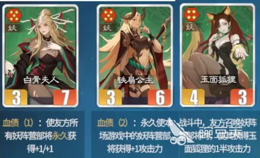 那么第二个为他大家介绍的就是当前的妖族阵营,妖族阵营里面大家可以使用的是牛魔王,铁扇公主,石矶娘娘,白象精,还有玉面狐狸以及白素贞,在这样的阵容组合起来的时候,其实大家玩起来的话,其中卡并没有一个专属的核心,因为这个流派里面妖族卡比较多,所以可以算出是一个多核心并肩的一个技能,其中角色基础大部分都是有召唤能力的,召唤基础效果都是要从里面的角色才能够带来的,比如说其中的石矶娘娘她拥有不屈状态的时候,带来的召唤物在承伤效果上面可以吃掉对面带来的很多伤害,而且她有一个免死的状态,可以进行触发的时候,让石矶娘娘可以不断的刷新指向对面的伤害,所以在敌方前排有足够能力的时候设计娘娘在这里完全可以应付起来。