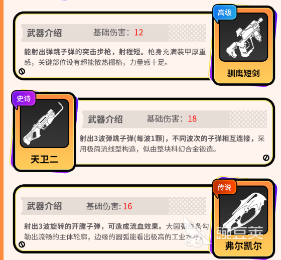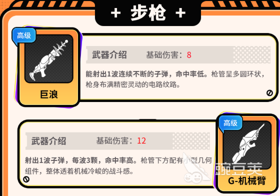 步枪家族的成员还是比较多的,每一把都会拥有独特的战斗风格。入门级可以选择巨浪,每一波能够射出三颗子弹,命中率比较高,基础性伤害是12点。新手如果选择这一把武器,就能轻松的应对战斗节奏,处理一开始的小怪。阿达哈克主要是走极致伤害路线18点基础伤害的大号子弹,虽然命中率低一些,但是威力十足,很适合喜欢爆发输出的玩家。如果喜欢灵活走位加上持续输出,那不如就选择高级步枪阿尔法。可以直接射出弹跳子弹,枪身会充满装甲的厚重感,力量感很出色。