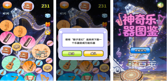 上百种精美的乐器类型应有尽有,从最基础的沙锤,再到最高档的钢琴等等。经典的关卡内容都有具体的分数要求或者是时间限制,从屏幕的正中央会随机掉落下不同的乐器类型,在此基础上又增加合成的元素,合理滑动屏幕,将两个相同的乐器发生碰撞,即可快速合成更高等级的乐器类型,其中还有骰子变幻的独特道具,能帮助大家突破高分,让其中任意的乐器变成为万能乐器。