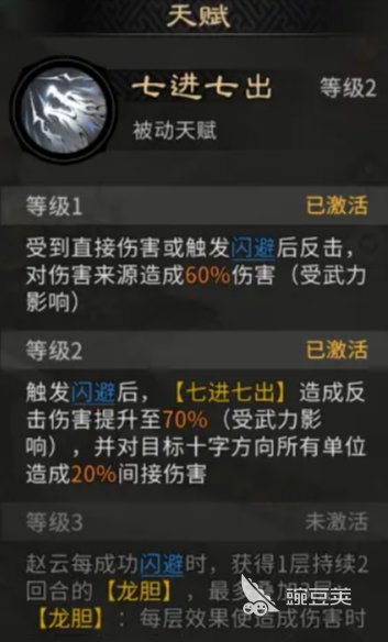赵云的核心天赋名为“七进七出”,具备三层递进式强化:基础效果为受到直接伤害或成功闪避时,立即对攻击来源发动反击,造成相当于自身攻击力60%的伤害;升至2级后,闪避触发的反击伤害提升至70%,并额外对目标所在十字方向(上、下、左、右)所有敌方单位施加20%的间接伤害;升至3级时,在闪避成功瞬间获得“龙胆”增益,提升自身后续伤害输出能力。