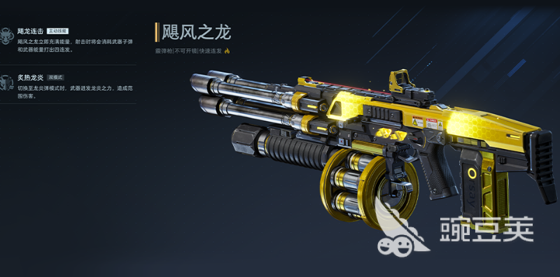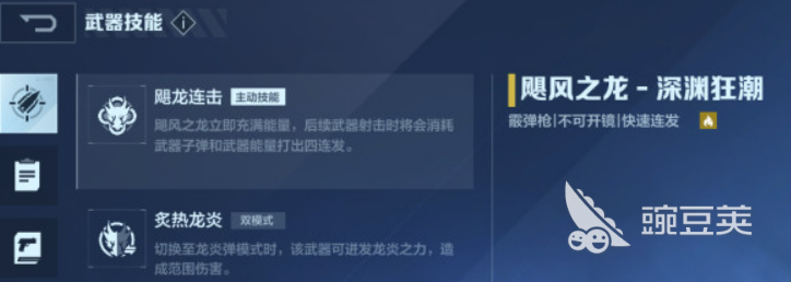 飓风之龙有两个技能,主动技能叫飓龙连击,被动技能是炙热龙炎。主动技能开启之后,接下来的攻击会消耗子弹和能量打出4连发,就算只按一下攻击键也会连续射击4次才停下来。双模式技能,炙热龙炎还可以切换成龙炎弹模式,将后前置弹夹切换会变成1发,后置弹夹就是15发,每发射一次都得重新装弹。如果在开启主动技能的状态下切换龙炎弹,前置弹夹会额外增加3发变成4发,后置弹夹相应减少但总数不变。
