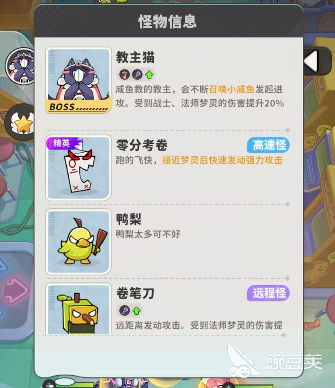 玩家们将在第10关遭遇两名精英敌人,其中一名为零分考卷,它是一个高速怪,会在出现后快速接近梦灵所在的防线,并利用自身特性对梦灵造成巨额的伤害,因而人们要么在它移动过程中用高输出直接把它消灭,要么上阵些可嘲讽、击退的梦灵将它控制住。另一精英敌人名为教主猫,它会在攻击时召唤小咸鱼一并发动进攻,若各位所选的梦灵都为单体攻击,那么在清理这些小咸鱼时会觉得无比头疼,所以更适合将清兵能力出色的法师梦灵加入队伍,以便能更快清理掉小咸鱼。