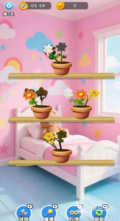满屏的盆栽花朵,每一朵都带着不一样的色彩,刚进关卡就能被这一片颜色晃到眼,玩法比较简单。只需要在不同的花盆里凑齐三朵一模一样的花,就可以把它们消灭掉,这一关里足足有几十种不同模样的花,每一种都有自己的小特色。我们要把屏幕上所有的花全部消干净,才算真正的闯过这一关,整个游戏的画风特别有趣,主背景是一间粉嫩嫩的小屋,搭配着各色花朵的点缀,看着就很舒服。