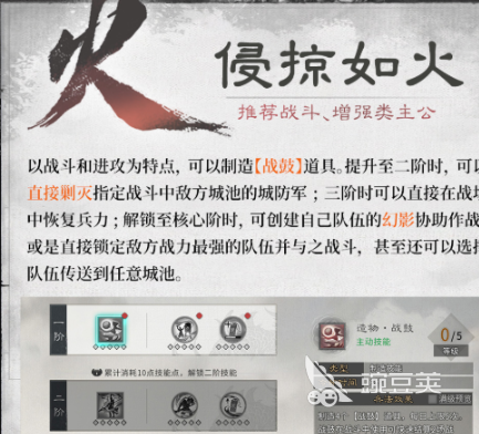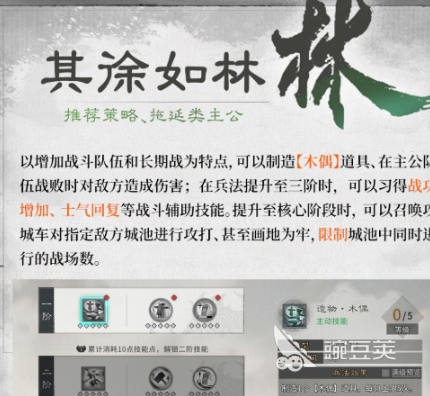 其徐如林走的就是辅助牵制的路线,核心主要是围绕战车强化,可以制造木偶道具。队伍战败时就可以给敌人造成伤害,随着兵法等级提升三阶就可以解锁战功增加以及士气回复等技能。核心阶段还能召唤攻城车去攻打城池,甚至还有画地为牢技能,可以限制敌方城池的战场数量。在攻城战中,用它去正面推进,借助道具可以延缓敌方的援军,可以稳步的控制战线。喜欢猛攻打法的玩家,那就可以直接选择侵掠如火,这套兵法比较注重于突击战术,可以有效提升攻击的优势,还能够削弱敌方的防御。