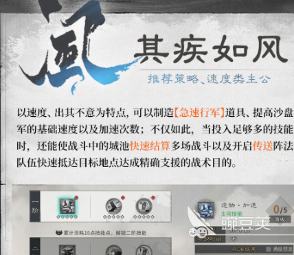 其疾如风把速度的优势发挥到极致,这套兵法就可以制造急速行军道具。能提升沙盘行军的基础速度,以及加速的次数,投入足够技能点之后,甚至还可以开启传送阵法,去有效实现精准支援。无论是突然袭击去打敌方,还是友军在遇到困难时的支援,全部都可以派上用场。尤其是敌方军队在分兵作战时,用它加速穿插,就可以轻松的完成战术包抄,特别适合喜欢速度流派的英雄。