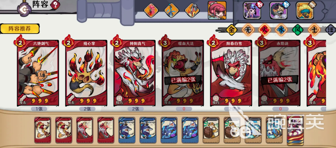 第二个注意事项,灼烧卡建议玩家带嗜血大法这样在无波可发现卡牌技能的加持下,必发现此卡,且配合着减重效果,可以让全体直接挂火。而在水系卡位置上可以选择碧水东流和烟雨剑法。