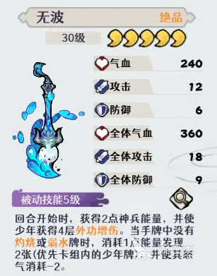 建议玩家将无波提升至30级后再进入到战斗,其主要讨伐思路是少年为主c+3狗,并且无波可谓少年稳妥提供四层外功增伤,而在满星后卡组当中的怒气值-2非常关键,在已有的基础怒气值或者是首回合所获得怒气值发出的灾祸下,仍然可打出伤害,这点非常重要,而其他两个备选兵器可以选择”炽痕+祝融“。