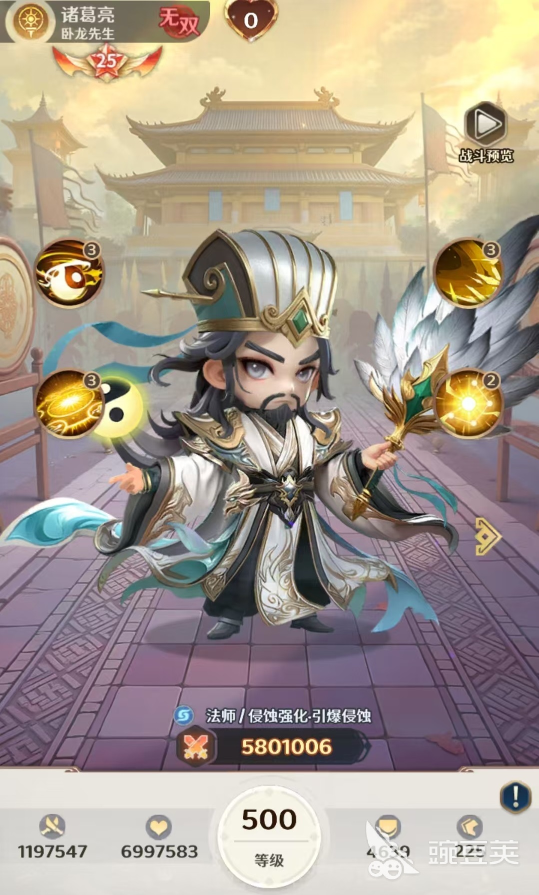 排名第三的无双诸葛亮,定位为法术群攻型核心。其大招可对全体敌人造成大量法术伤害,并强制引爆目标当前所承受的所有“混沌侵蚀”层数,实现多段连锁爆炸。在被动加持下,每次引爆混沌侵蚀时,还会为目标生命比例最低的友方单位恢复一定生命值,兼顾爆发清场与团队续航,是兼具功能性与输出效率的复合型法师。