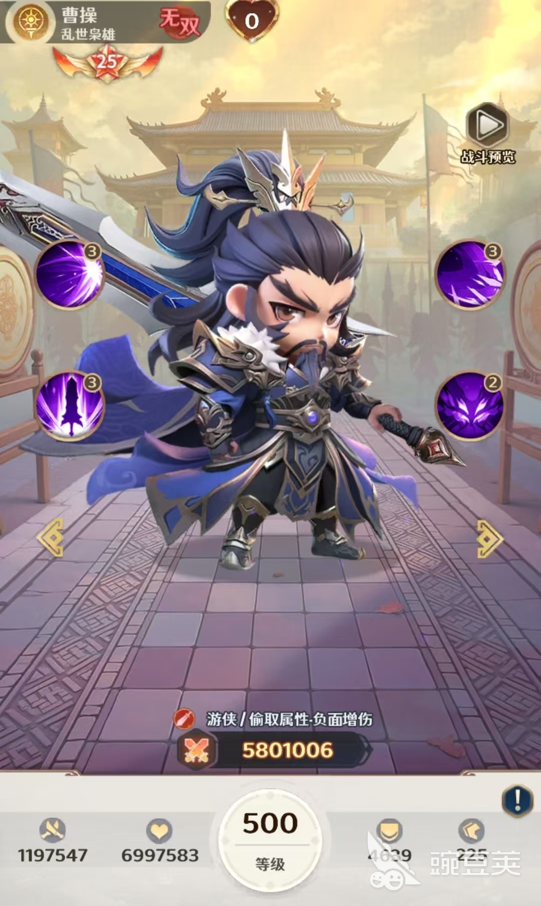 稳居第二的是无双曹操。作为高适配性物理核心,其大招伤害直接挂钩敌方负面状态层数,层数越多,倍率越高。与具备中毒、灼烧、禁疗等持续Debuff能力的队友(如庞统、周瑜)搭配时,后期输出呈指数级增长。此外,该技能还附带“偷暴击”与“偷暴击率”双重机制,大幅提升命中稳定性;被动则提供攻回生命与受击概率偷取抗爆效果,在强化自身生存的同时有效削弱敌方防御体系。
