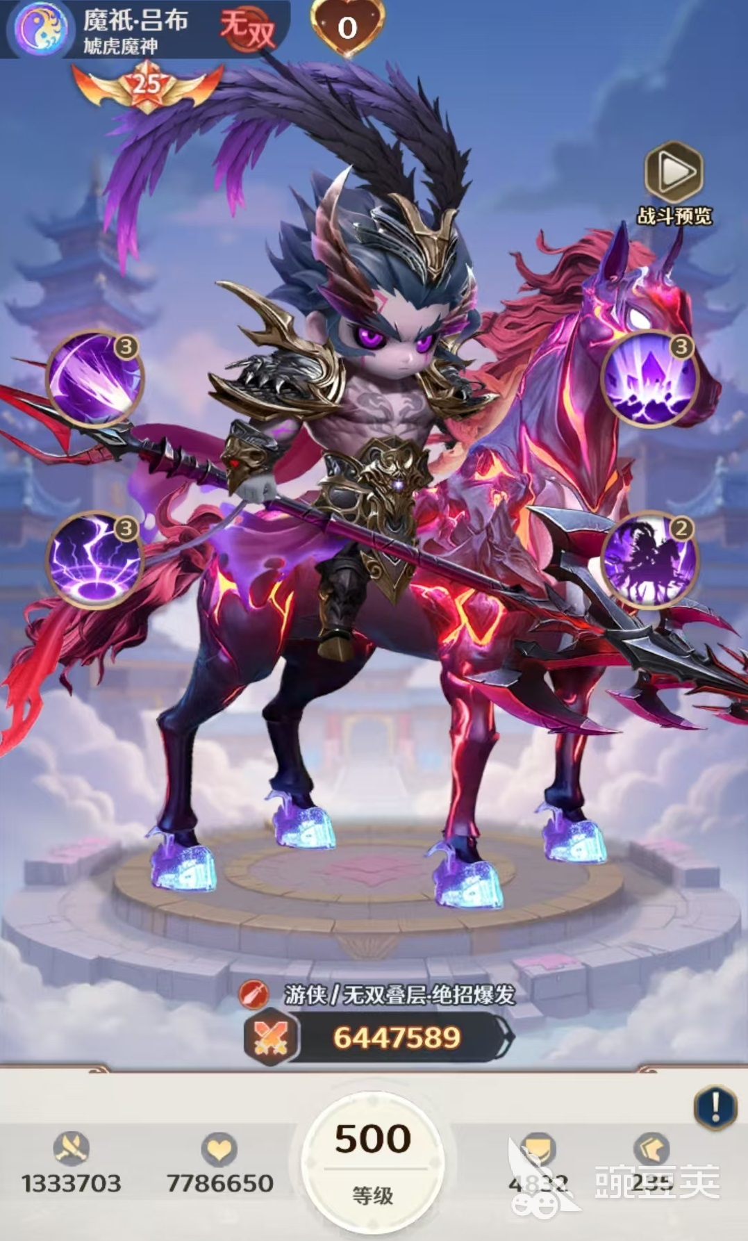 位列强度榜首位的是魔吕布。其核心机制为“无双叠层”——每次释放大招后自动获得1层无双,层数越高,大招基础伤害与附加效果越强。该技能可对敌方全体施加高额物理伤害,并有概率触发“神罚”状态;当敌方存活单位≤3人时,本次攻击额外提升暴击率。配合被动“天下无双”,无双层数可进一步转化为爆发倍率,实现一招清场的压制效果,是当前版本无可争议的顶级主C。