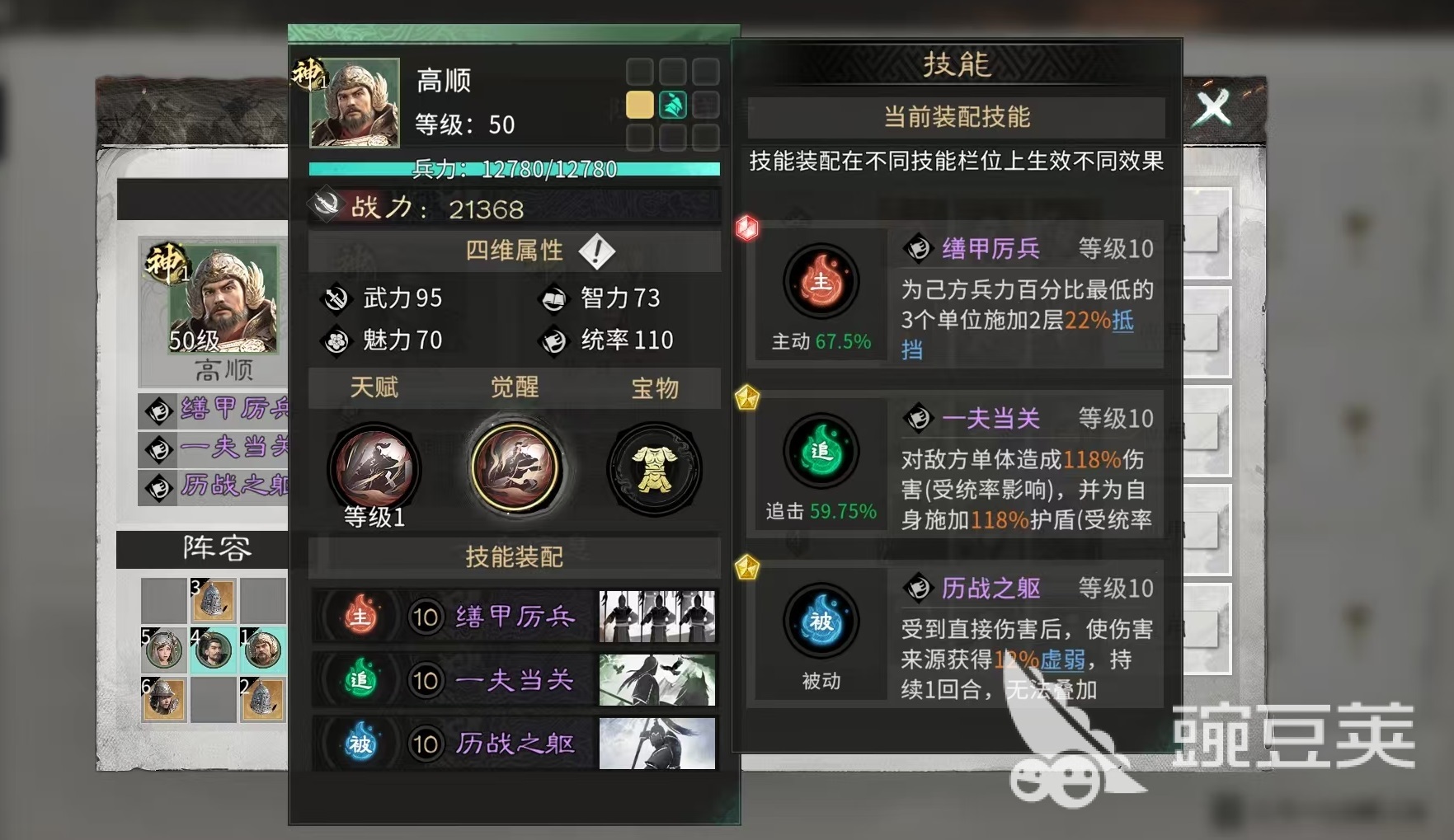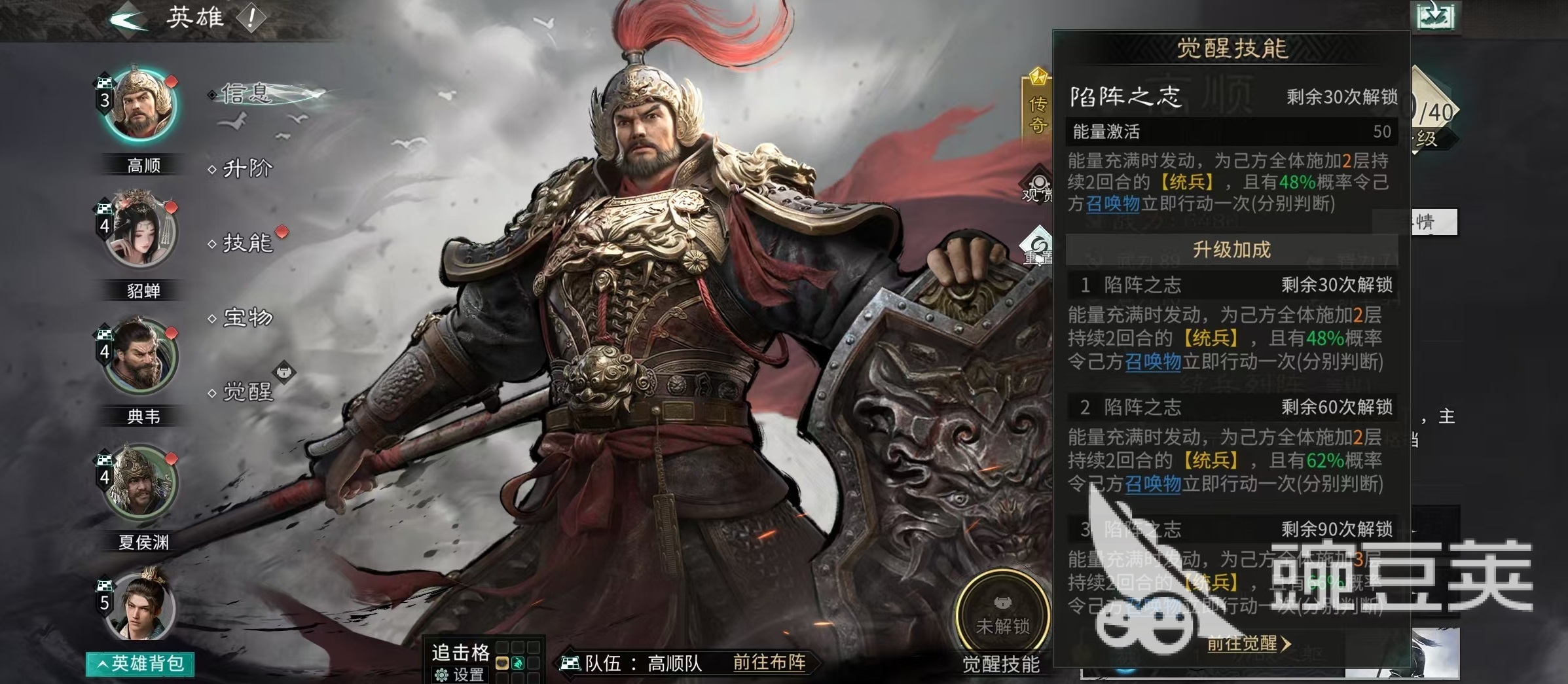 角色定位上,高顺以统率为成长主轴,初始属性即体现其作为前排壁垒的特性。天赋【统兵列阵】提供三层复合机制:首回合在前排生成一名“陷阵勇士”,该单位继承高顺80%基础属性;每大回合开始时对敌方目标发动范围伤害;主动行动时为全体友军施加两层【统兵】效果,持续两回合,每层提升6%格挡率;当高顺或陷阵勇士受到直接伤害时,有概率触发反击,若格挡成功,反击伤害还将获得额外加成。