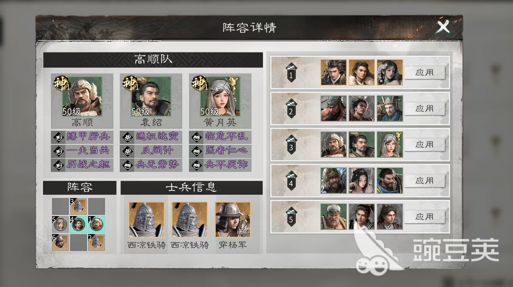 阵容布阵方面,士兵配置选用两名西凉铁骑与一名穿杨军。站位安排为:前排——高顺+西凉铁骑;中排——袁绍+西凉铁骑;后排——黄月英+穿杨军。此布局兼顾抗压能力、召唤物输出密度与技能覆盖范围。