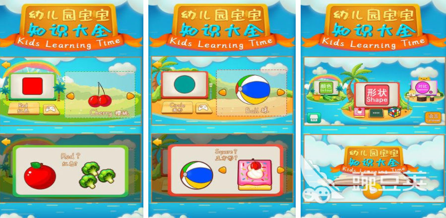 本作围绕颜色识别、图形辨识与基础比较三大核心能力展开模块化设计。通过拖拽匹配、点击响应、声音反馈等低门槛交互方式,引导幼儿完成形状归类、色块配对、大小/长短对比等任务。所有认知对象均配有高清实物图与标准发音,支持中文单语及中英双语播报,同步强化汉字字形认知与基础英语词汇输入,为语言敏感期提供可重复、可泛化的学习素材。