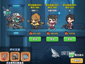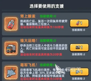 进入到活动里面以后,是允许大家适用支援道具的,游戏中能够让大家使用的道具分贝是肾上腺素、撞大运咯以及霉军飞机,肾上腺素主要是在自身挑战死亡以后,有一次复活的机会,还能随机刷出3个对手,撞大运咯则能够直接将最强的三个敌人给秒杀掉,死亡以后虽然能够复活,氪疲劳值却不会恢复,霉军飞机,则能够召唤出霉军飞机轰炸对人。