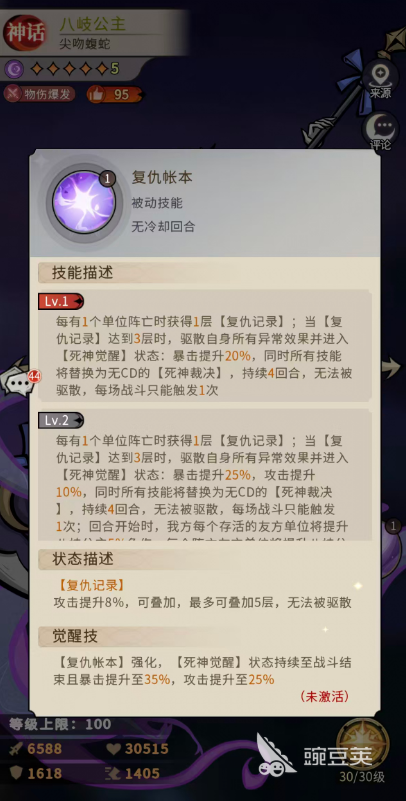 另外对于蝮蛇体质这个技能,在其中一开始就可以给八岐公主提升25%攻击和15%生命,10星升级为35%攻击和20%生命,而18星也就是升级到技能三级的时候提升的是45%攻击、25%生命和10%伤害加成。最后一个技能是复仇帐本,这个技能是八岐公主针对自身的状态带来的被动,场内每次有1个单位阵亡的时候,在其中就可以获得1层复仇记录,而当复仇记录达到3层时,可以驱散自身所有异常效果并进入死神觉醒状态,其中的暴击可以提升20%,同时所有技能将替换为无CD的死神裁决,而且这个效果一直会延续4回合,当然因为能力持续时间很长所以基本每场战斗只能触发1次,一般在每有1个单位阵亡时获得1层复仇记录的时候,只要有3层,就可以驱散自身所有异常效果并进入死神觉醒状态,此时的暴击提升25%,攻击也会有10%的提升,同时所有技能将替换为无CD的死神裁决,而且在回合开始时,我方每个存活的友方单位将提升八岐公主5%免伤,每个阵亡友方单位将提升八岐公主5%伤害。