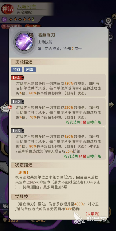 这里【剧毒】的状态对于一些守卫或者是辅助单位的角色来说,这里可以造成的伤害是直接无视对面25%防御数值的,而这里造成的【剧毒】效果就是让携带该效果的单位法术免伤降低5%,在输出的回合结束之后损失自己生命上限5%的生命,此时损失的这个血量是最大不能超过施法者100%攻击数值的,最多叠到5层的时候,用八岐公主走一个中毒流就完全没有问题的,而觉醒之后的嗜血镰刀技能得到强化,此时大家就可以看到有基础480%的伤害,而且对守卫还有辅助类型的敌人造成的伤害会无视30%防御数值。