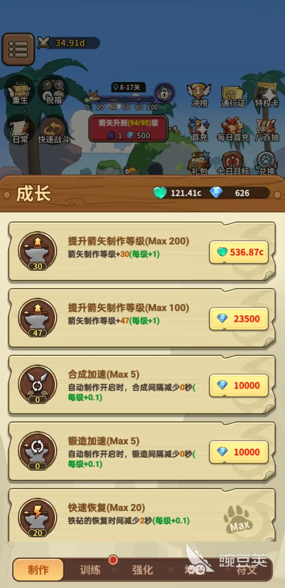 当玩家手中的资源比较丰富的时候,就可以开始制作箭矢。要说这个其实是整个游戏中的核心装备,他也能够决定玩家的战斗力,最基础的做法是在铁砧上消耗资源来开始制作。不过玩家需要注意铁砧上面存储会出现上限,在此时应该领取,避免直接被溢出。制作完成之后就可以开始合成,合成的时候需要两个等级相同的届时开始合成。当然这种方式能够有效地获取高级的届时,对于玩家来说,将合成好的箭矢直接拖到英雄身上,这时候英雄的攻击力将会提升。