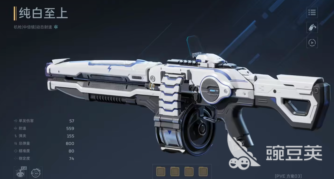 还有一把主武器叫纯白至上,这枪的数据面板看着比雷霆999更漂亮一些,就是换弹时间稍微长了点,不过配合插件也能解决这个毛病。小编感觉它开箱的概率比999低一些,所以放在第二个讲。它的主动技能叫磐石身躯,开启后会有个力场保护,能减少28%的伤害,同时持续射击的话每0.25秒还能叠加8%的增伤效果,最高可以叠到96这个加成就很夸张了。而且触发条件特别简单,基本上战斗过程中都能保持高增伤状态。被动技能强力冲击也很给力,射击的时候射速会慢慢提升,最多能提升100%,本来射速就不慢,现在还能翻倍,打起来手感特别好。