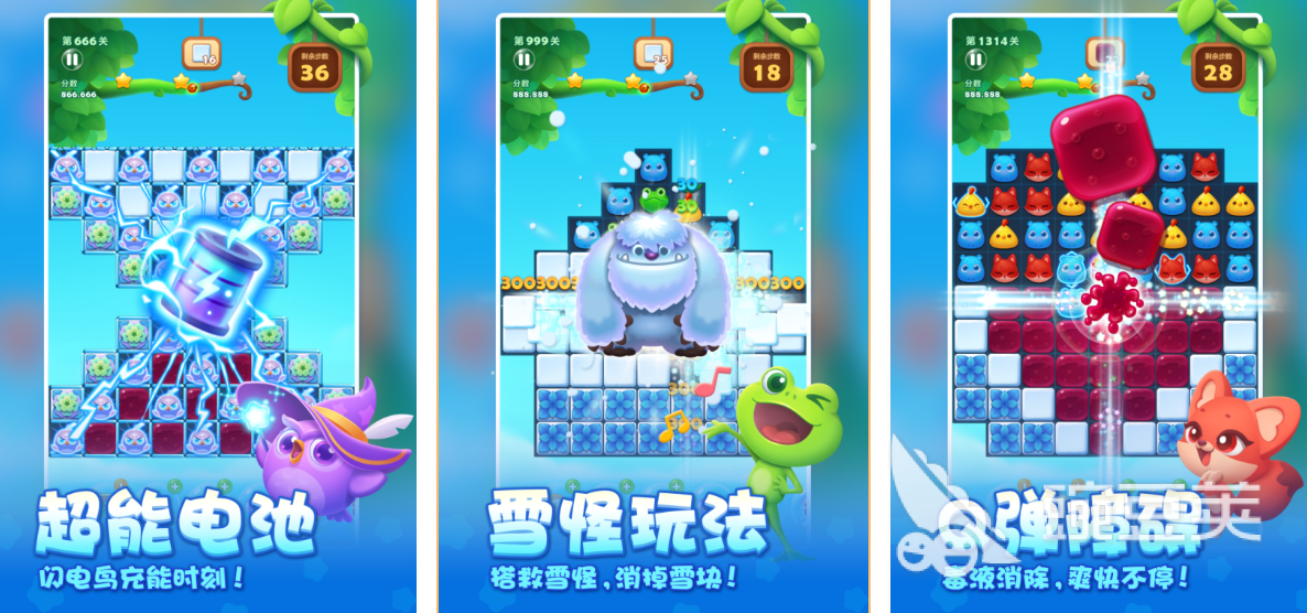 《开心消消乐》游戏是以一棵参天的藤蔓为主轴的关卡,玩家通过交换相邻的小动物头像来达到三连或者以上的消除效果,从而收集目标元素或者打破障碍。该作最出彩的地方就是关卡梯度设计的十分考究,从简单的冰块消除到复杂的藤蔓阻隔和章鱼毒液,每一关都需要玩家具备前瞻性的步数规划能力。游戏加入了很多特效合成,四连的直线特效、五连的魔力鸟都可以产生翻江倒海的清屏效果。