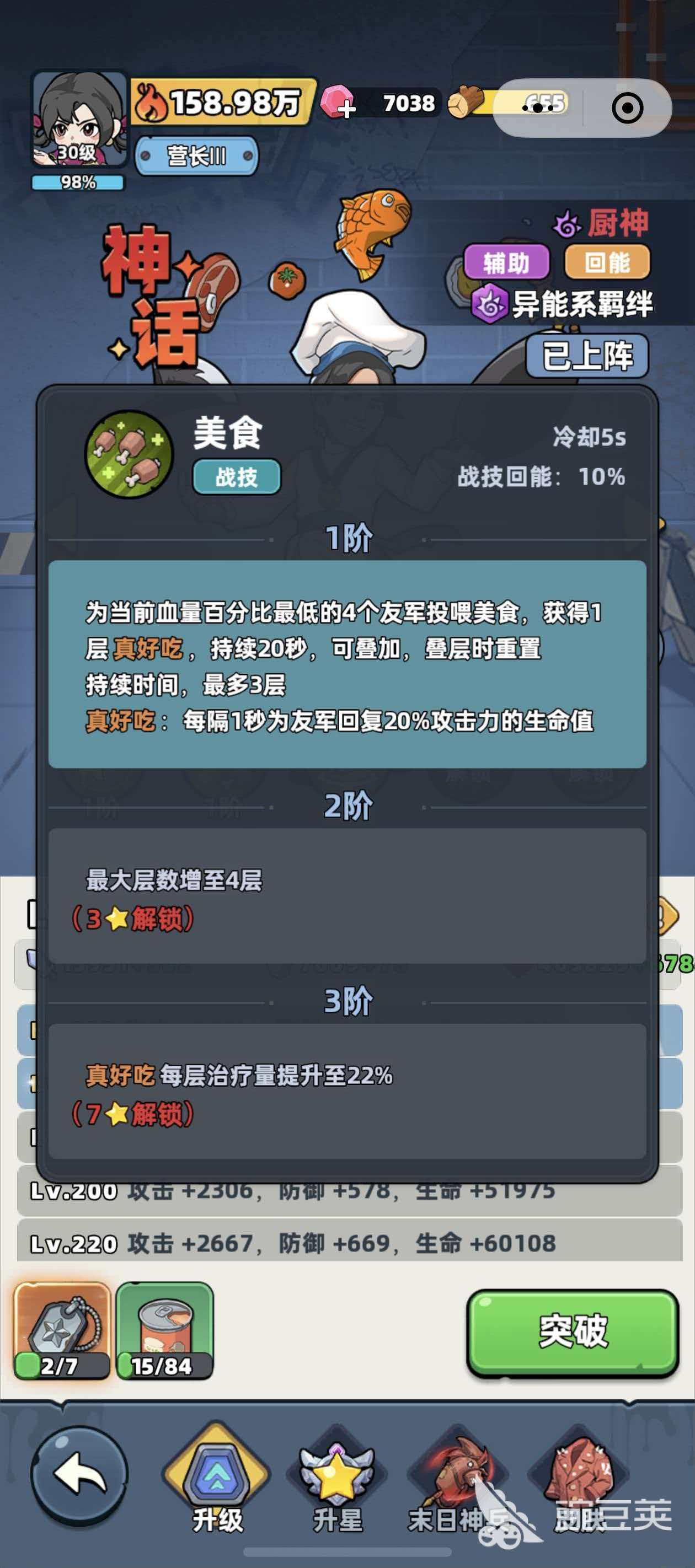 战技美食这个技能在释放以后,厨师会快速的找到当前队伍中血量百分比最低的四名队友,锁定队友以后,厨师就会给他们投喂食物,投喂食物可以获得1层真好吃的效果,该效果能够持续20秒的时间,效果能够叠加使用,叠加该效果时持续的时间会进行充值,最多能够叠加3层该效果,真好吃效果可以每隔1秒钟的时间给队友回复20%攻击力的生命值,等技能到了2阶以后真好吃能够叠加到4层。3阶时真好吃的治疗效果可以从20%提升到22%。