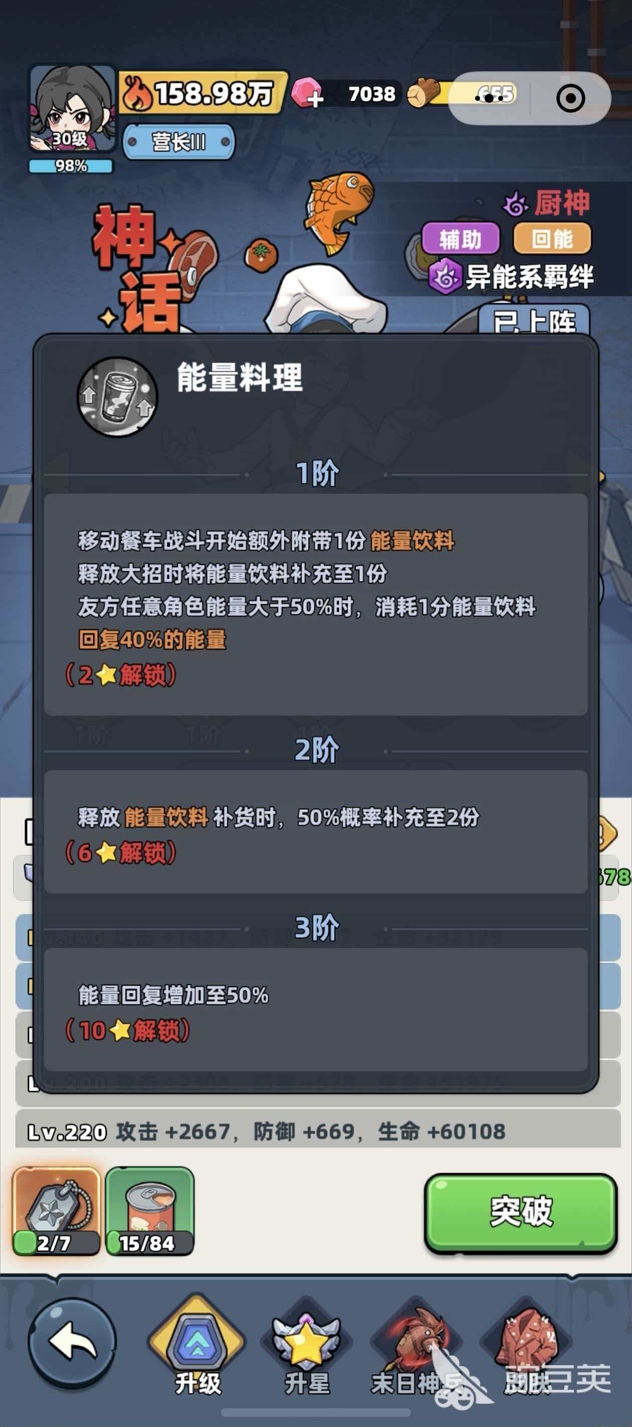 能量料理这个技能是厨师移动蚕食开始战斗时能够额外携带1分能量料理,使用大招时,能量料理会直接给自身补充1分钟的能量,若是我方队友的能量大于50%的时候,会消耗1分能量饮料回顾40%的能量,技能2阶的时候释放能量饮料补给时,有50%的概率补充至2份,3阶时回复的能量会增加到50%。