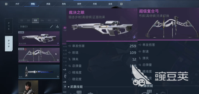 主武器可以选择裁决之眼,这把枪在机甲战中会拥有顶尖的表现,核心的优势全部都在技能上。主动技能在激活之后就可以迅速的提升暴击率,又或者是暴击伤害,让每一发子弹都拥有杀伤力。暴击命中之后还能解锁高额的攻击速度加成,这一整套技能组合下来,裁决之眼的输出能力就可以呈现出几何级的增长,面对厚重的机甲,也可以撕开防线。副武器方面可以选择超级复合弓,裁决之眼在开启主动技能之后就可以激活超级复合弓的技能,两者效果在叠加之后就可以提升更多的伤害。