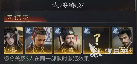 缘分系统方面,“五谋臣”组合(郭嘉、程昱、荀彧、荀攸)可激活专属羁绊。当其中任意三人同编一队时,所有缘分武将获得5%“看破”属性提升,并降低4%所受伤害。该效果在对抗高命中、高暴击队伍时尤为关键,是提升整体生存韧性的底层增益。
