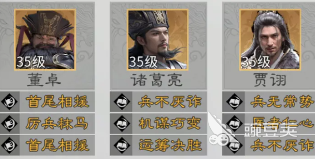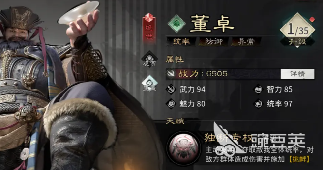 董卓:是很多氪金大佬的专属选择,虽然养成成本比较大,获取的难度较高,但是辅助输出的能力还是很有优势性的。属于一个进攻型的坦克,天赋独断专权可以带来多重减益效果,在主动发动时就能够夺取敌我双方的全体统帅。针对敌方三个单位可以造成伤害,并且还有挑衅,可以吸引火力,还可以削弱敌方的属性。二级天赋解锁时,被挑衅单位攻击时,董卓就有概率反击,并且还会施加一个易伤的效果。推荐的阵容是诸葛亮,还有董卓以及贾诩 。前排可以用藤甲兵,后排可以带五斗米祭。