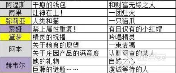 【阿涅斯】的干瘪的钱包,来自和财富无缘之人。【雨果】的灶神在上,来自一团灶火。【弥莉亚】的人类和猫,来自一只猫爪。【索娅】的禁止属性重复,来自有且仅有的小红帽。【黛梦】得精灵的祝福,来自吟唱精灵。【阿本】的关于粮食的愿望来自一束麦穗。关于庄园产品的满意度,来自认真调查的某人。【赫韦尔】的他的礼物,来自自然之心。巨藤的谜题来自虔诚等待的人。