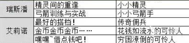 在这个玩法之中,它有一问一答的形式来呈现,而玩家们在其中会发现很多个标题都会拥有着同一个角色名字,这也是比较容易混杂的事情,第1个【瑞斯潘】它的标题是精灵间的重逢、弓箭训练与实战,而他来自小小精灵,或者是小小弓箭手;【埃莉诺】则是最好的搭档,来自传奇佣兵。金币金币金币,来自花钱如水的可怜人。嘿嘿,借点钱吧,来自穷困潦倒的可怜人。