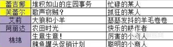 【蕾吉纳】的堆积如山的庄园事物,来自忙碌的某人。【芙蕾尔】的歌声窃贼,来自抓狂的某人。【艾莉】的大狼和小羊,来自瑟瑟发抖的羊毛卷卷。【阿丽达】的农田时光,来自快乐的耕作者。【绵绵】的生意生意,来自厉害的小商人。腌鱼罐头促销计划,来自聪明的小商人。